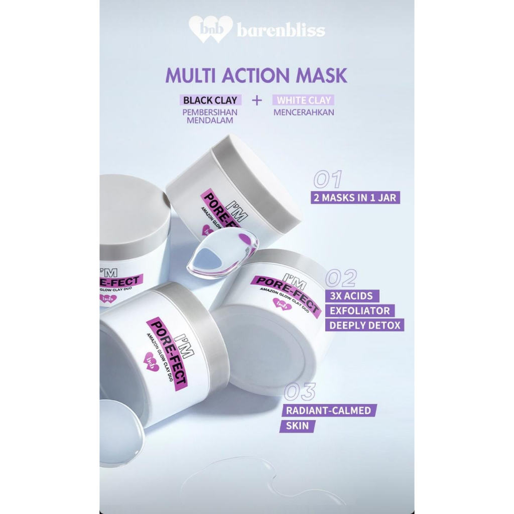 BNB I'M PORE FECT AMAZON GLOW CLAY DUO Clay mask 2in1 yang membantu mengurangi minyak berlebih dan poripori tersumbat, membuat wajah tampak lebih cerah dan halus.