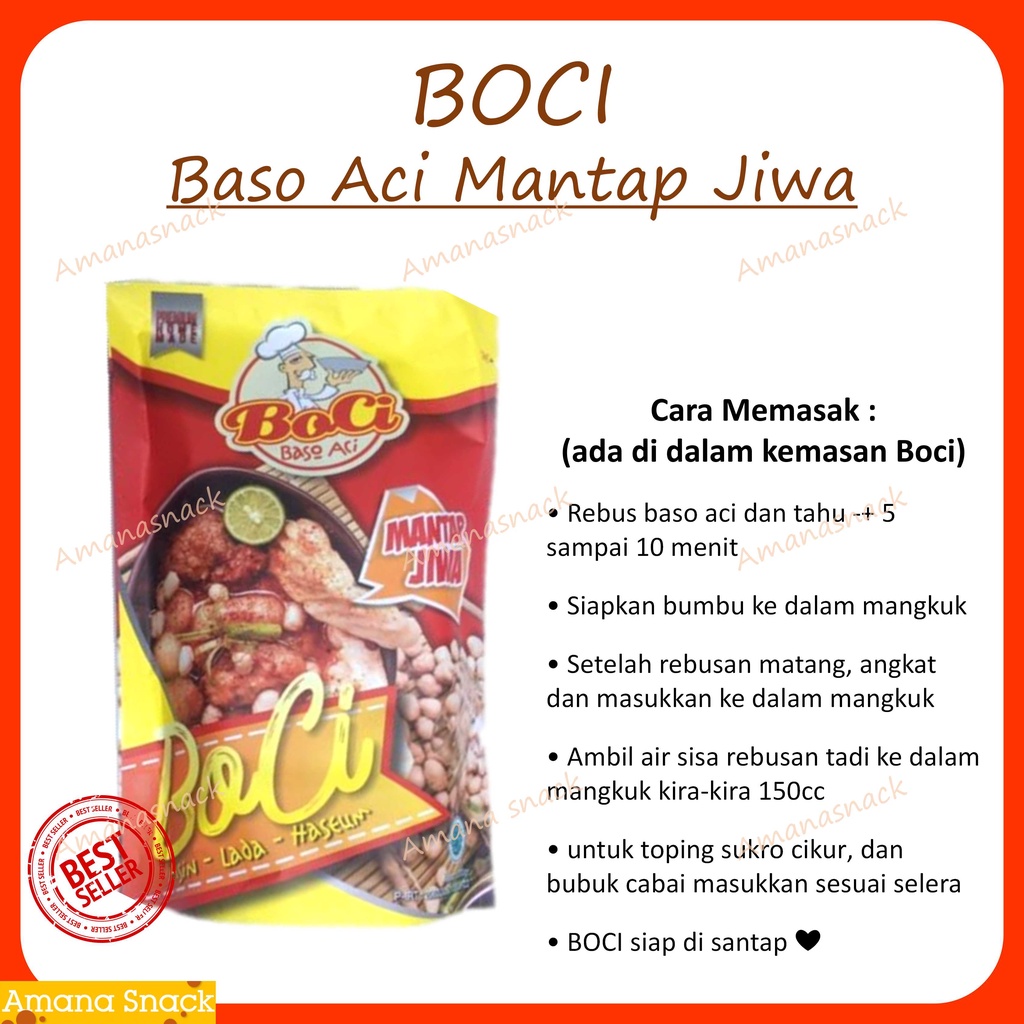 "Cara memasak (ada di belakang kemasan boci) : • Rebus baso aci daan tahu -+ 5 sampai 10 menit • Siapkan bumbu ke dalam mangkuk • Setelah rebusan matang, angkat dan masukkan ke dalam mangkuk • Ambil air sisa rebusan tadi ke dalam mangkuk kira-kira 150cc • untuk toping sukro cikur, dan bubuk cabai masukkan sesuai selera • BOCI siap di santap ❤"