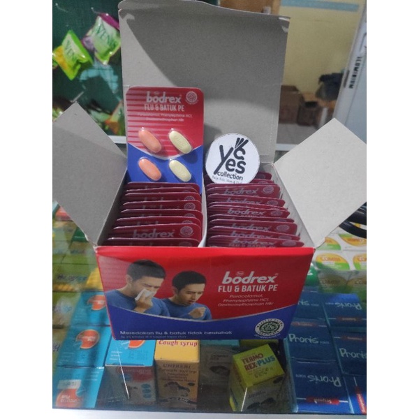 1. Bodrex Flu & Batuk PE * Harga untuk 1 Blister 4 Kaplet lapis dua * 1 Box isi 25 Blister * Komposisi Mengandung Paracetamol 500mg, Phenylephrine HCI 10mg, Dextromethorphan HBr 12 mg