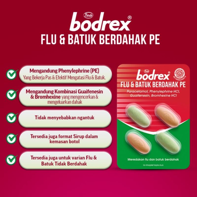 Bodrex Flu & Batuk Berdahak PE Merupakan rangkaian produk dari keluarga bodrex dengan PE (Phenylephrine) yang bekerja aktif meredakan gejala flu & batuk. Kombinasi paracetamol, phenylephrine, glyceryl guaiacolate dan bromhexine, bekerja sebagai analgesik-antipiretik (penurun panas), dekosngestan (pelega) hidung, ekspektoran (pengeluaran dahak, dan mukolitik (pengencer dahak). Efektif mengencerkan dahak dan mengatasi rasa gatal di tenggorokan. Tersedia dalam kaplet yang praktis dan sirup yang memberikan sensasi melegakan di tenggorokan.