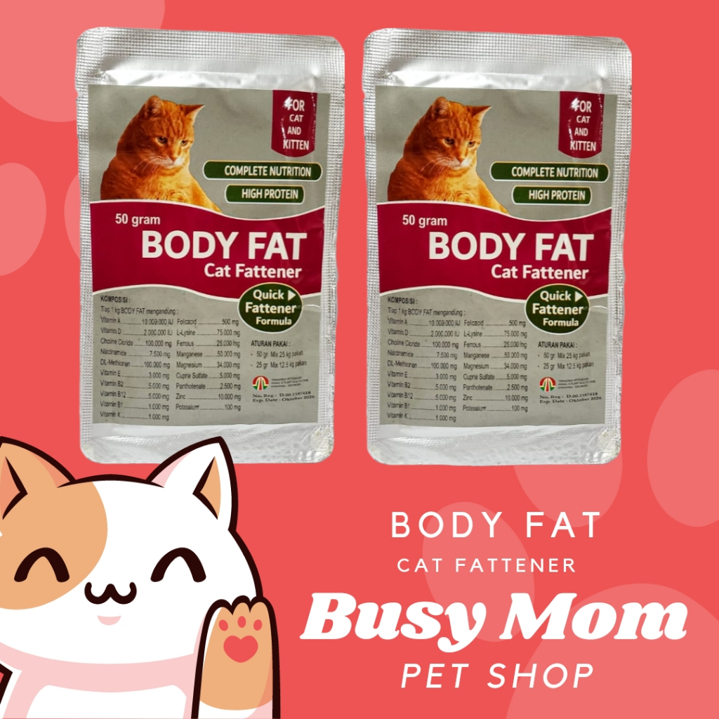 Body Fat 50g merupakan cat fattener suplemen / suplemen berbentuk serbuk yg dapat menggemukkan kucing anda sehingga lebih fit dan sehat. Body Fat mengandung multivitamin dan protein tinggi diformulasikan khusus untuk menaikkan napsu makan kucing, bisa dicampur di makanan kering/basah