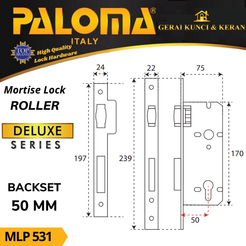 Mortise Lock / Lockcase / Body Kunci Roller PALOMA. - Warna : PVD Gold. - High quality mortise lock. - Extra security, drill and saw resistant deadbolt. - Heavy duty, passed 200000 test cycles. - For high frequency of use such as for public doors in office buildings. - Suitable for wood or metal door mass up to 150kg. - Using high quality stainless steel grade SUS 304. - Nickel 9% and chromium 18%. - High resistance against rust and corrosion. - 25 Years Mechanical Warranty. - Designed according to European standards.