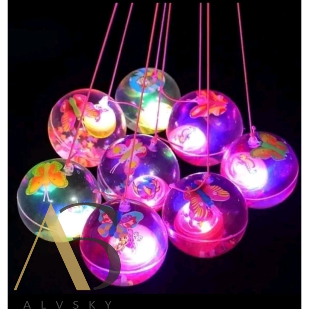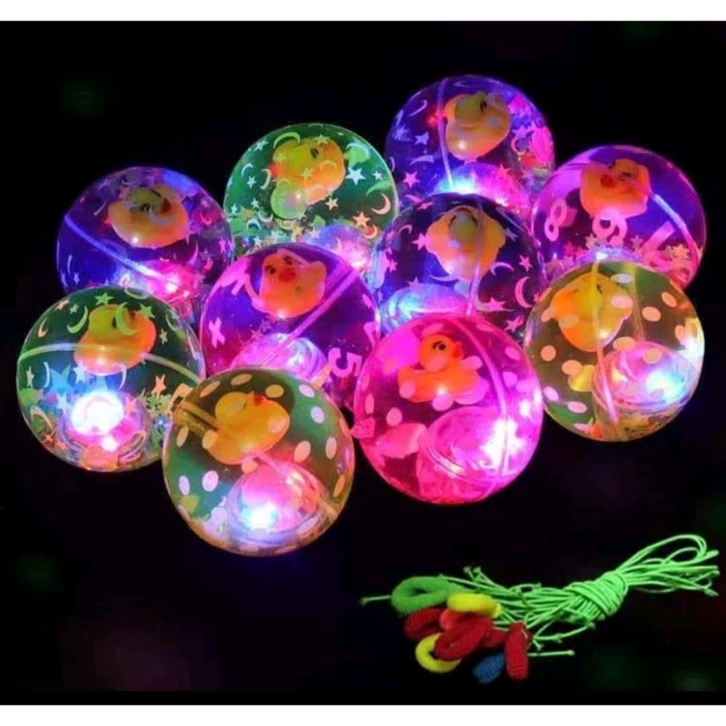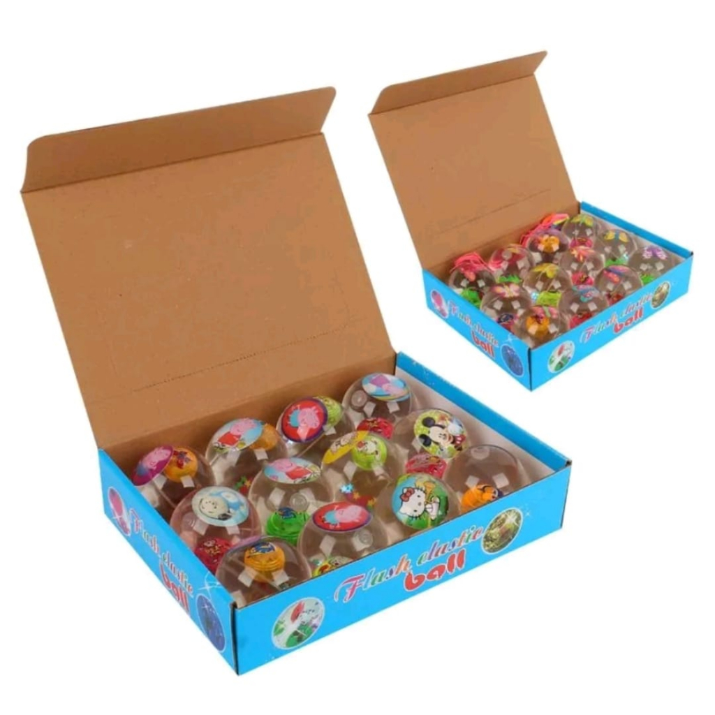 Bola yang berisikan air dengan aksesoris berkarakter didalamnya serta terdapat lampu yang dapat menyala berkedip apabila bola di pantulkan ke lantai Bola dapat dipakai untuk ber main bekel dapat juga sebagai mainan bayi yang sudah dapat merangkak dan berjalan
