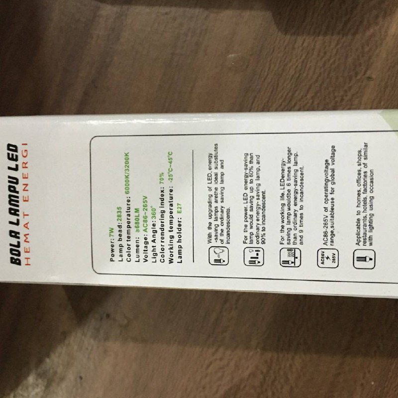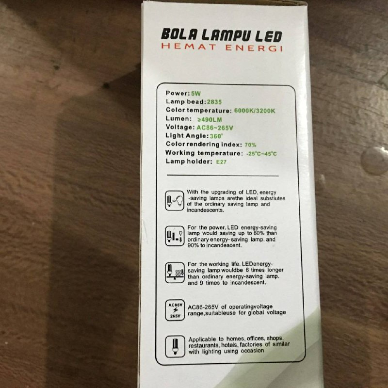 1. Led 5 Watt - Lampu bead : 2835 - Color Temperatur : 6000K/3200K - Lumen : >490 LM - Lamp Holder : E27 - Color Rendering Index : 70 %