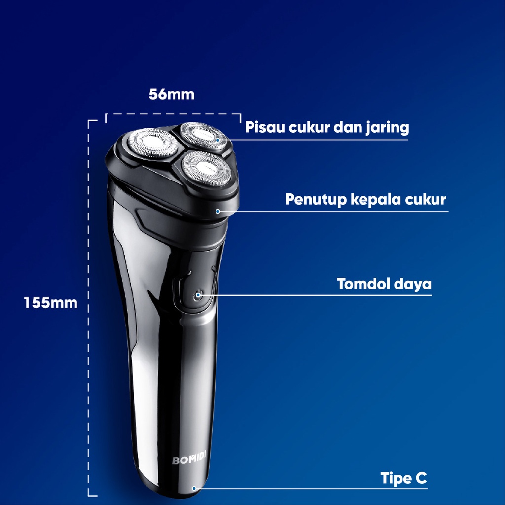 BOMIDI Alat Cukur M3 Fitur: 1.Alat mencukur basah dan kering. Seluruh bodi mesin dapat langsung di rendam dan di cuci di dalam air IPX 7 tahan air. 2.Alat cukur 3D memiliki area pencukuran yang lebih besar daripadaalat cukur biasa, cocok untuk bentuk wajah yang berbeda, dan dapat mencukur dengan cepat. 3. Jaring pisau lapisan ganda setipis 0,09 mm sangat meningkatkan efisiensi pencukuran dan tidak meninggalkan residu. 4. Secara otomatis mengasah pisau, semakin sering digunakan, maka akan semakin tajam. Saat alat cukur dinyalakan, pisau diasah secara otomatis, sehingga pisau tetap tajam dan tahan lama 5.Sistem EMS yang pintar. Daya yang kuat, cukur dengan sangat bersih, tingkat kebisingan rendah, tidak membangunkan anggota keluarga yang sedang tidur. 6.Alat cukur yang cerdas, mendapatkan pengalaman super keren dalam seluruh proses, halus sampai akhir, pertahankan kecepatan konstan saat baterai rendah, hindari rasa malu memotong jenggot. Sistem EMS cerdas untuk melindungi mesin dari kelebihan beban dan overheat. 7. Mengisi daya selama 1 jam dan bertahan selama 3 bulan. Dapat bekerja saat dicolokkan ke listrik ketika tidak ada daya, pengingat pengisian cerdas dan tampilan daya. 8. Pengisian tipe-C, dapat berbagi kabel pengisian daya dengan ponsel, komputer, power bank dan portable 9. Alat pencukur dapat dibuka dengan satu tombol di bagian belakang alat cukur, yang nyaman untuk memangkas janggut panjang dan pendek.