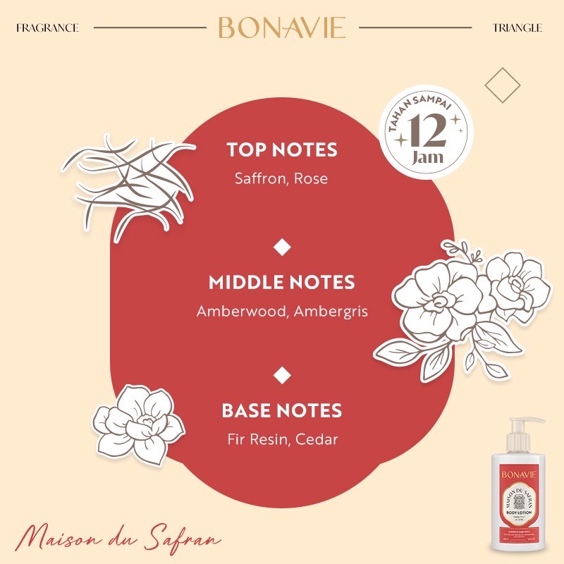 Bonavie Body Lotion melembapkan, mencerahkan, sekaligus mengharumkan kulit tubuh dengan aroma mewah yang menyegarkan sepanjang hari , keharumannya tahan sampai 12 Jam. Aroma Bonavie Body Lotion Maison du Safran memiliki karakter elegan, sensual, seductive dengan sentuhan modern. Paduan aroma Saffron elegan dikombinasikan dengan aroma Rose modern serta Aroma sensual hangat dari Caramel, Moss dan Musk memberikan pengalaman unik yang sensual menghangatkan