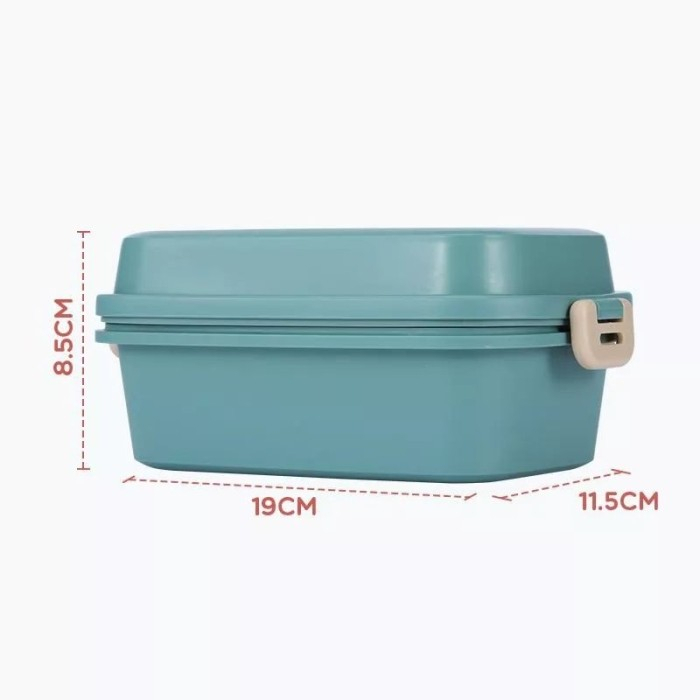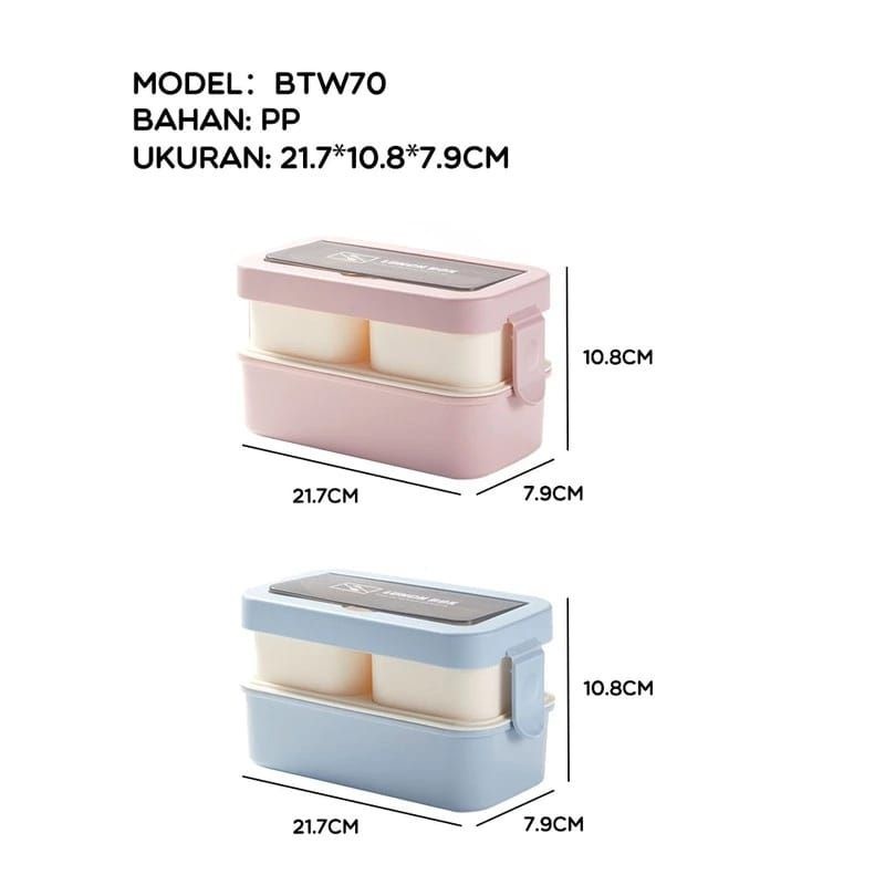 Deskripsi Tipe : BTW100 Warna : Biru, hijau Bahan : PP Ukuran: 19x11.5x8.5 cm Kapasitas: 980ml Berat : 100gram Kotak Bekal 2 layer / susun dilengkapi dengan alat makan : sendok & garpu