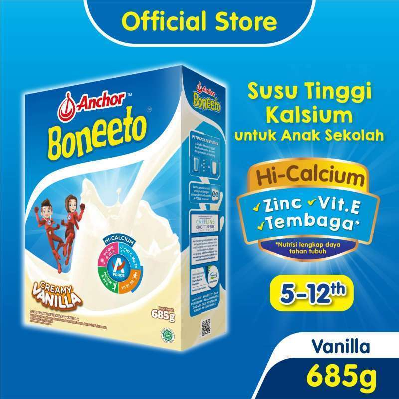 DESKRIPSI PRODUK : Susu Anchor Boneeto A-Force, susu untuk pertumbuhan dan perkembangan anak usia sekolah. Terbuat dari susu New Zealand berkualitas tinggi mengandung A-Force yaitu tinggi kalsium, sumber protein, 12 vitamin dan 9 mineral yang dapat membantu membantu tubuh aktif dan daya pikir aktif serta #BebaskanHebatnya.