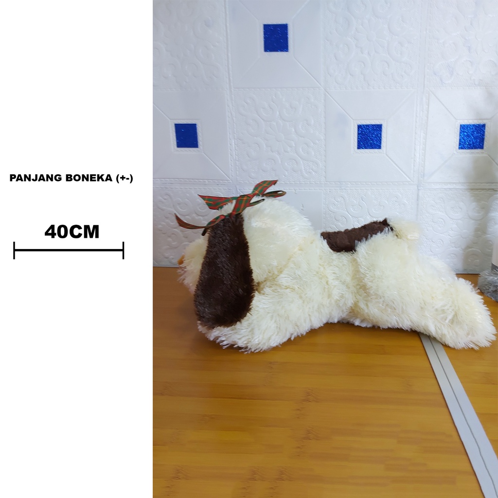 - Nama Produk : Anjing Pita - Bahan : * Cover : Terbuat dari bahan Rasfur yang halus, lembut, tidak mudah rontok. * Isian : Dacron Silicon jadi empuk dan nyaman. - Ukuran : Panjang (+-) 40cm