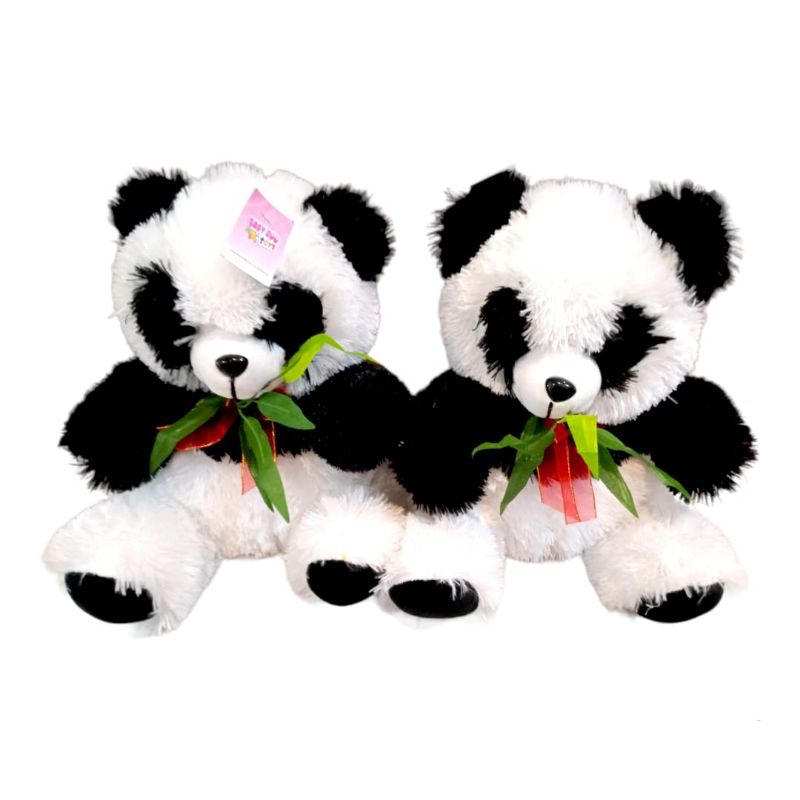 Boneka panda bambu lucu, cocok digunakan untuk pribadi maupun untuk kado, bulu rasfur yg halus dan lembut, terdapat pita dan daun mainan pada bagian depan boneka.