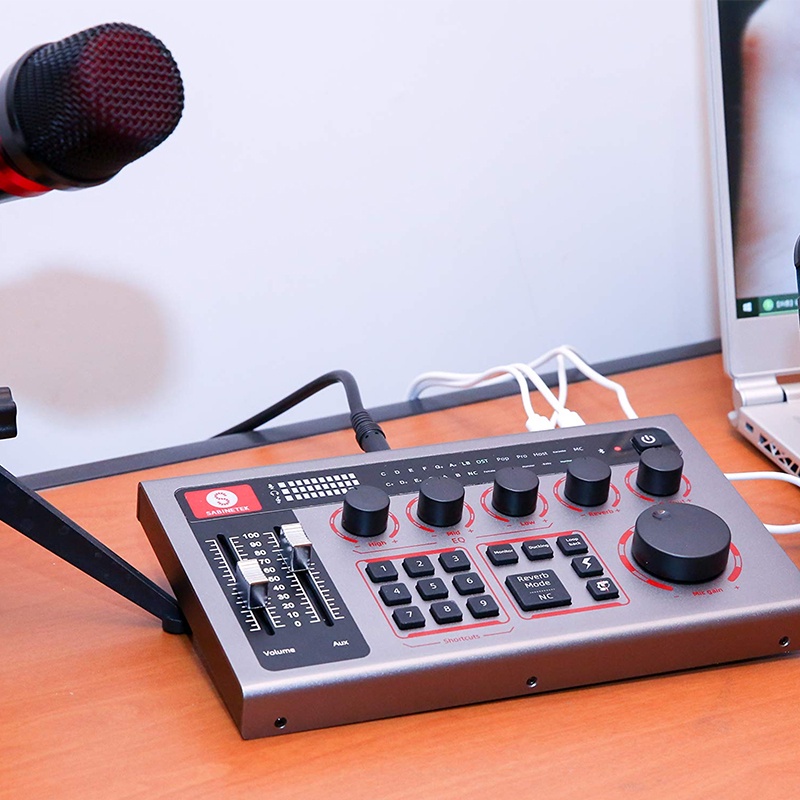 Sound card bagi Anda yang ingin merasakan sensasi karaoke di rumah serasa di studio family karaoke ataupun studio music. Alat ini juga dilengkapi spesial efek untuk mengubah suara asli Anda menjadi lebih lucu. Ada efek suara tepuk tangan dan tertawa juga loh sebagai respon instant saat teman Anda bernyanyi. Alat ini juga berfungsi sebagai equalizer untuk mengantur bass, treble, reverb sesuai keinginan Anda. Alat ini juga bisa digunakan ketika Anda sedang live stream di TIKTOK, Youtube, misalnya.