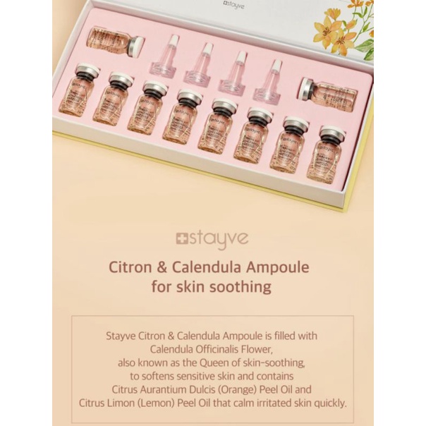 * Citron & Calendula Ampule * Citron & Calendula Ampoule mengandung Calendula Officinalis Flower sebagai bahan utama yang dikenal sebagai Ratu Penenang Kulit. Ini membantu menenangkan dan menenangkan kulit sensitif seperti kulit kering atau pecah-pecah, dan juga ideal untuk kulit bermasalah karena membantu penghambatan peradangan dan memperkuat jaringan kulit untuk menyembuhkan luka. Ini juga mengandung bahan lain seperti Citrus Limon Peel Oil yang sangat ideal untuk kulit berminyak dan bermasalah dengan cara membersihkan kulit.