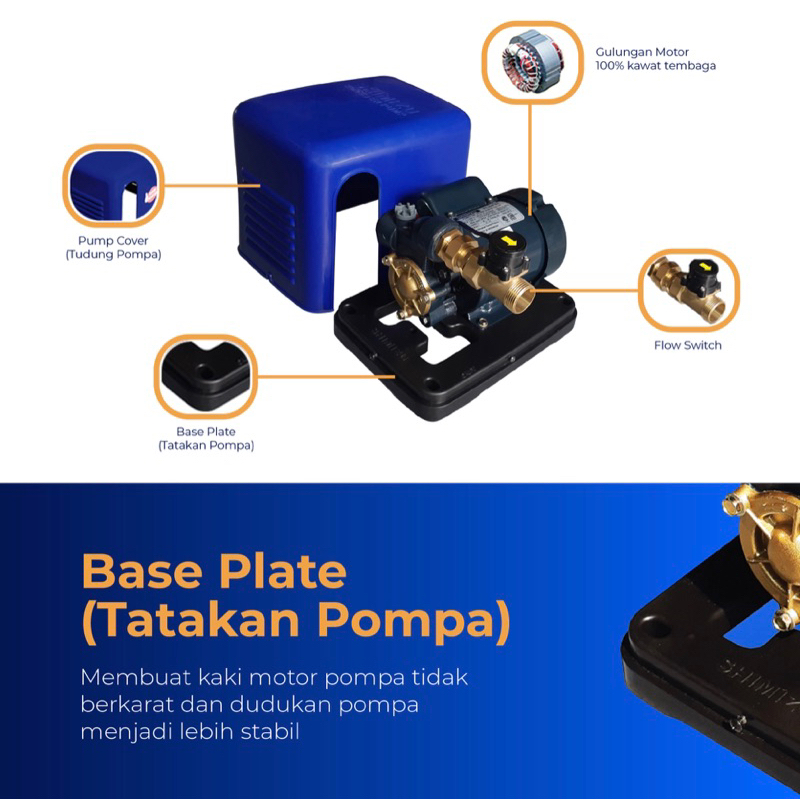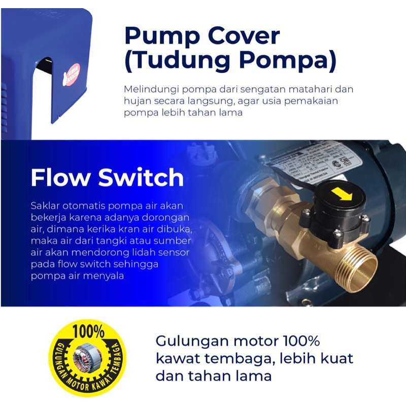 Gulungan motor 100% kawat tembaga Garansi motor 3 tahun 24 Jam nonstop plumbing Kapasitas besar. Maskimal 40L/menit Daya pancar kuat, output bisa untuk 6 keran Flow switch Dapat base plate (tatakan pompa) membuat kaki motor pompa tidak berkarat dan dudukan pompa menjadi lebih stabil Dapat pump cover (tudung pompa) melindungi pompa dari sengatan sinar matahari dan hujan secara langsung, agar usia pemakaian pompa lebih tahan lama
