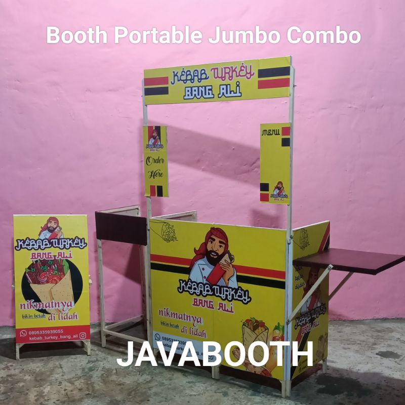 ini produk baru kami ya booth porrtable Kayu Jumbo combo dengan ukuran 180x90x45 cm Dilipat dari bagia body kanan kiri , depan dan meja kompor dan meja sampingnya di lipat. sangat simple dan kokoh.