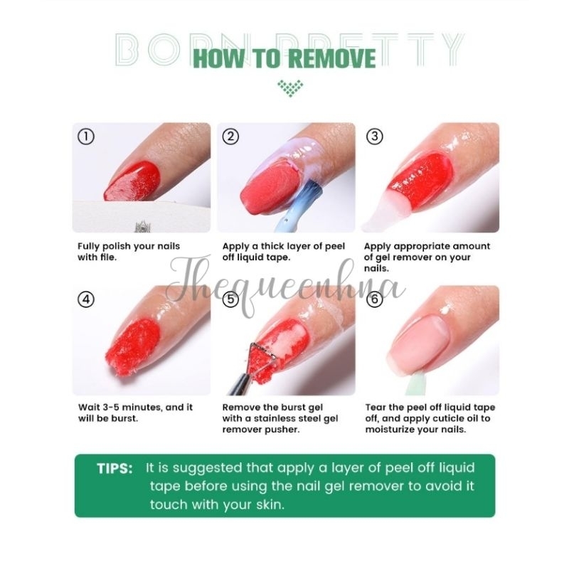 Cara pemakaian: Kasarkan/kikir permukaan top coat gel kemudian oleskan magic remover gel,diamkan selama 3-5menit/disesuaikan dengan ketebalan layer kutek,lalu kikir/keruk kutek gel yang telah beruntus.Oleskan vitamin kuku atau cuticle oil setelahnya