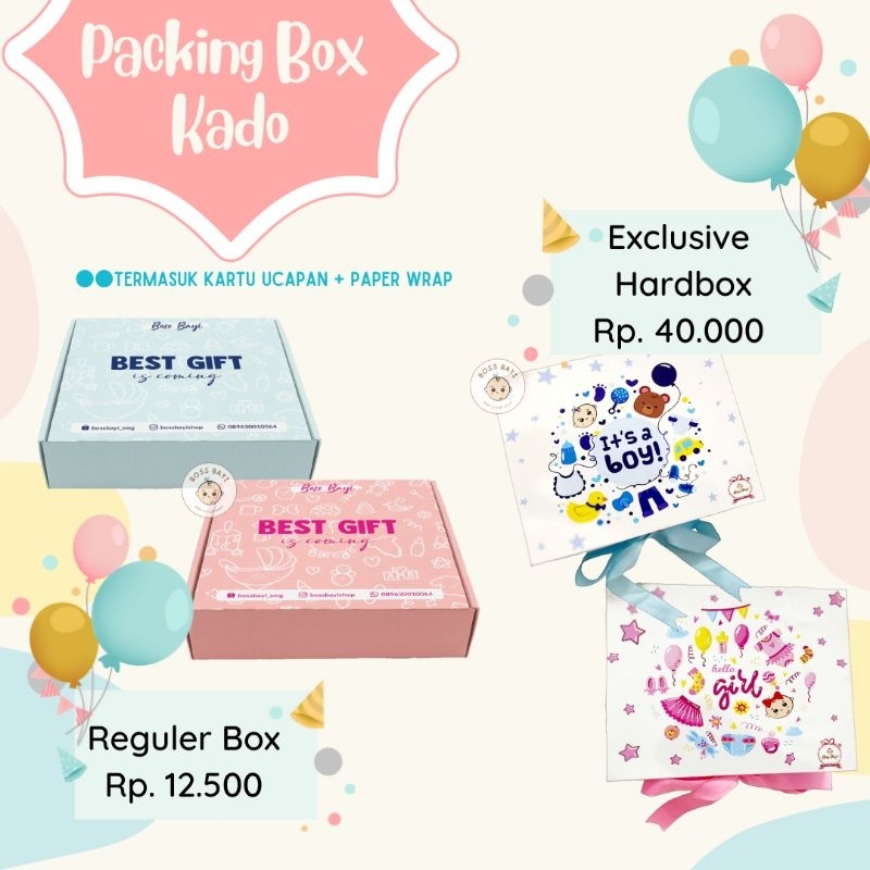Pilihan box ada 2 type : 1. Reguler Box 22x22x8cm --> Rp 12.500 2. Exclusive Hardbox 22x28x6cm --> Rp 40.000 **harga sudah termasuk Pita, Wrapping, dan Giftcard