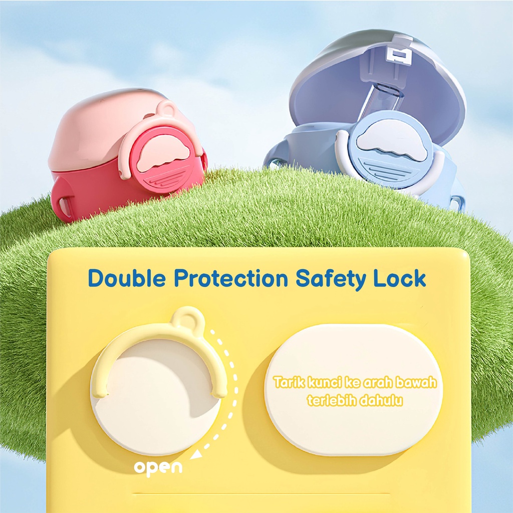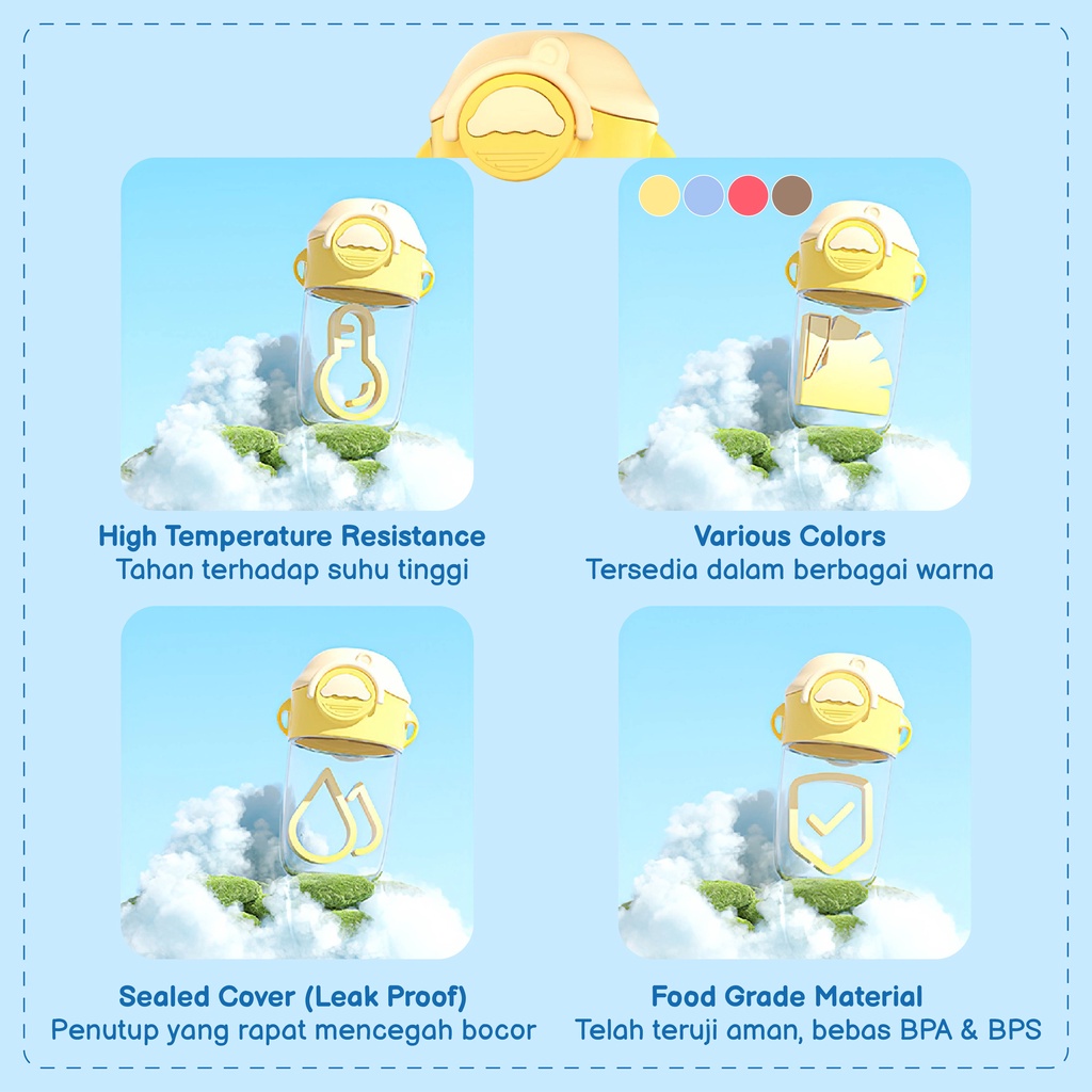 ⭐ Fitur dan Spesifikasi: - Desain perlindungan ganda pada tutup; Safety Lock dan Push Button. Mencegah botol terbuka sendiri. - Memiliki pengait berupa cincin pegangan yang mudah digenggam. - Dengan hanging lanyard (tali) yang bisa di panjangkan hingga 1 meter. - Terdapat sealed rubber ring pada bagian dalam tutup guna mencegah kebocoran. - Terdapat lubang udara dengan penutup karet. - Sedotan mudah dibersihkan/disterilisasi karena setiap bagian sedotan mudah di bongkar pasang. - Bebas dari BPA dan BPS. - Kapasitas 360ml. - Tutup, Safety Lock, Push Button, dan Pemberat Sedotan dibuat dari bahan PolyPropylene. Tahan suhu dari -20°C hingga 120°C. - Sedotan dibuat dari bahan Silicone Rubber. Tahan suhu dari -20°C hingga 120°C. - Cangkir dibuat dari bahan PCT Tritan. Tahan suhu dari -10°C hingga 100°C. - Telah Memenuhi Standar Indikator Higienis Food Contact. - Dimensi Produk: Tinggi 16.5cm. Lebar ke Samping 9.5cm. Lebar dari Depan ke Belakang 9.2cm. Diameter Cangkir +- 7.7cm. - Dimensi Kemasan: P10 x L9.3 x T16.5 (cm) - Berat Pengiriman 400 gram