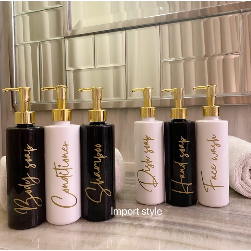 Perlengkapan Rumah > Kamar Mandi > Dispenser, Tempat, & Kotak Sabun > botol 250ml LONG , HITAM PUTIH stiker GOLD NEW . aesthetic bottle refill tempat sabun cair pump estetik luxury look .