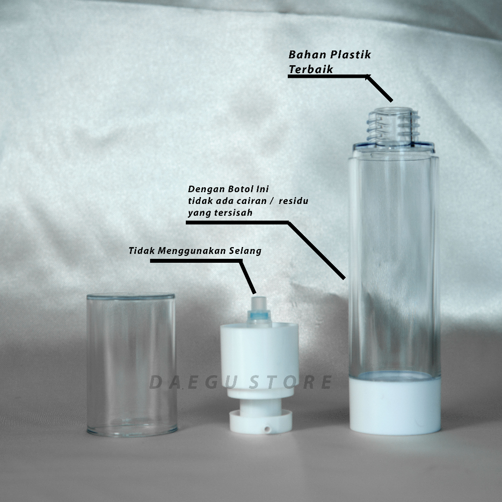 + Menggunakan sistem vakum, tanpa selang + Tidak menyisakan lotion kamu di dasar / dinding botol + Cocok untuk : Lotion, Serum, Hand Cream, Sunscreen, Moisturizer, dll + Mudah untuk diisi ulang (refill) dan dibersihkan + Tersedia ukuran : 15ml - 30ml - 50ml - 80ml - 100ml - 120ml + Travel friendly - cocok untuk dibawa traveling