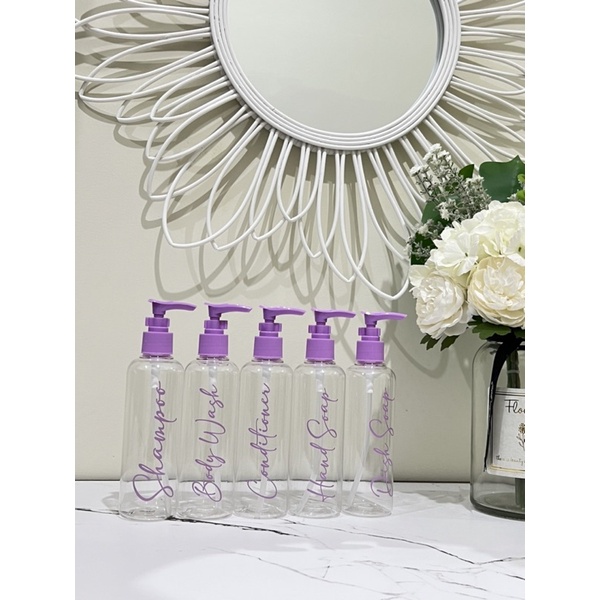 Perlengkapan Rumah > Peralatan Makan > Botol Minum & Aksesoris > botol BENING 250ml stiker LILAC . aesthetic bottle refill tempat sabun cair pump estetik