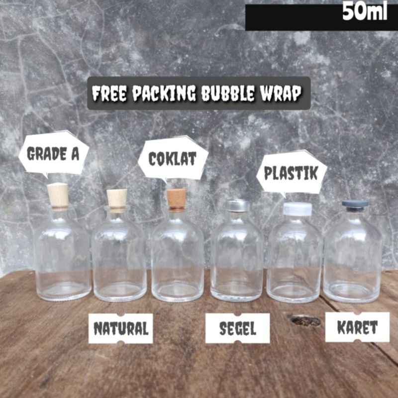 Detail Botol Kaca VIAL 50ml BENING / 50ml tutup kayu gabus / plastik / karet / segel / botol diffuser