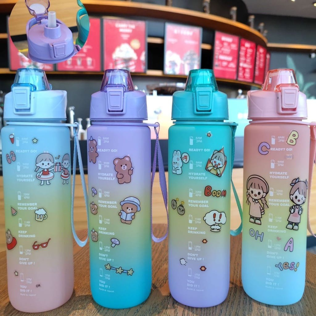 Botol minum dengan desain Tali jinjing dan penanda waktu motivasi. Transparan dengan skala, bagus untuk membuat rencana minum air setiap hari Keamanan food grade berkualitas tinggi, 100% BPA FREE, bebas bau dan sehat untuk minum harian Anda, bisa untuk piknik, perjalanan, hiking, berkemah dan berolah raga Botol air minum di desain dengan tali agar mudah di bawa,di desain dengan berbagai warna cerah seperti pelangi, sangat ideal untuk orang yang Anda cintai, untuk membantu mereka tetap terhidrasi dan sehat.