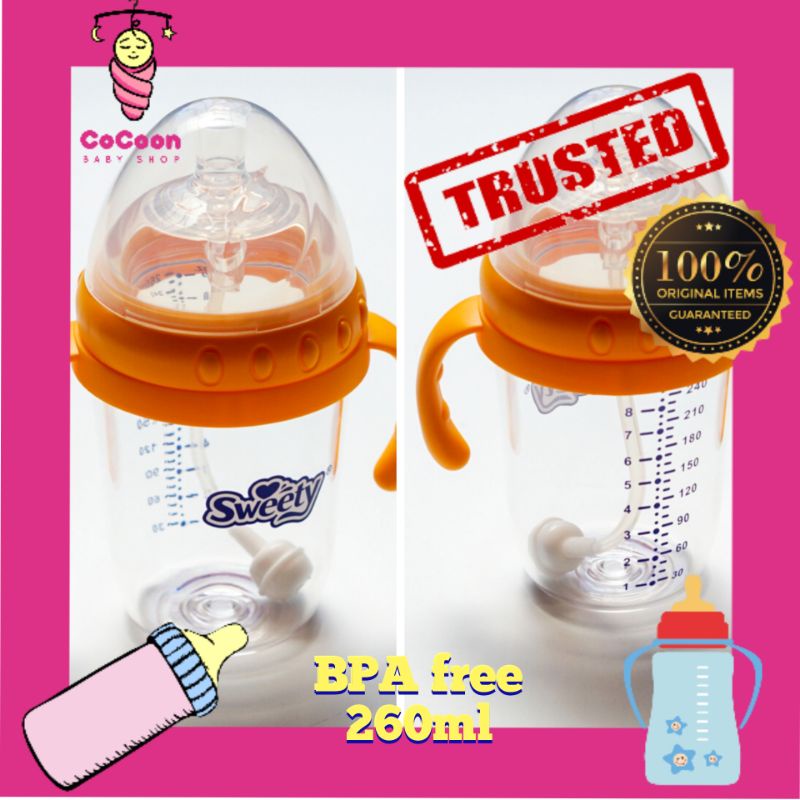 Keunggulan Sweety Baby Glass Bottle with handle: 1. 100% BPA Free 2. 360 derajat pippete and straw: Memungkinkan bayi untuk meminum dari berbagai arah 3. Bahan Copolyester: Merupakan jenis plastik food-grade berkualitas tinggi yang diimpor langsung dari USA. Sifat plastik yang bening seperti kaca membuatnya tidak mudah pecah dan tergores. 4. Extra Wide Neck Bottle: Ukuran leher botol yang lebar membuat ibu lebih mudah untuk mencuci maupun membuat susu di dalam botol serta membantu menstimulasi motorik si kecil 5. Steam Proof: Memiliki ketahanan panas hingga 100 derajat celcius sehingga aman direbus di air mendidih, steam uap, pemanas susu, dan microwave. 6. Anti Debu: Tutup botol anti debu sehingga dot bayi tetap higienis 7. Anti-Colic Technology: Dot anti colic yang mengurangi udara masuk ke dalam botol susu dan menghindari bayi dari tersedak