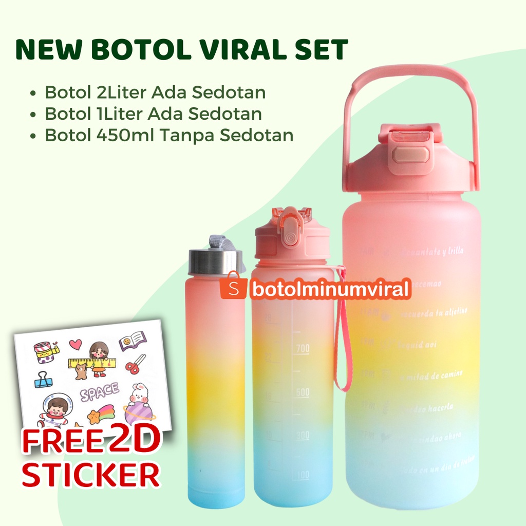 Botol Minum Viral Rainbow Free Sticker Set Isi 3pcs Sedotan Strap Lucu . Detail Produk: ๐ Kapasitas: 2000ml, 1000ml, 450ml ๐ Tutup Karet Seal Anti Tumpah ๐ Ada Strap ๐ Ada Sedotan Minum ๐ Botol 2L: Diameter 20cm, Tinggi 28,5cm Botol 1L: Diameter 14cm, Tinggi 22,5cm Botol 450ml : Diameter 8cm, Tinggi 20,4cm ๐ Tutup Clip Ada Sedotan ๐ FREE Sticker 2D . Terdiri dari : ๐ 1 Botol ukuran 2Liter ๐ 1 Botol Ukuran 1Liter ๐ 1 Botol Ukuran 450ml ๐ 3 Sticker 2D ๐ 1 Tali Strap . Demi keamanan dan kenyamanan Anda berbelanja, sangat disarankan untuk menambahkan packing BUBBLEWRAP/ KARDUS dalam pembelian Anda. Kerusakan akibat pengiriman diluar tanggung jawab kami.
