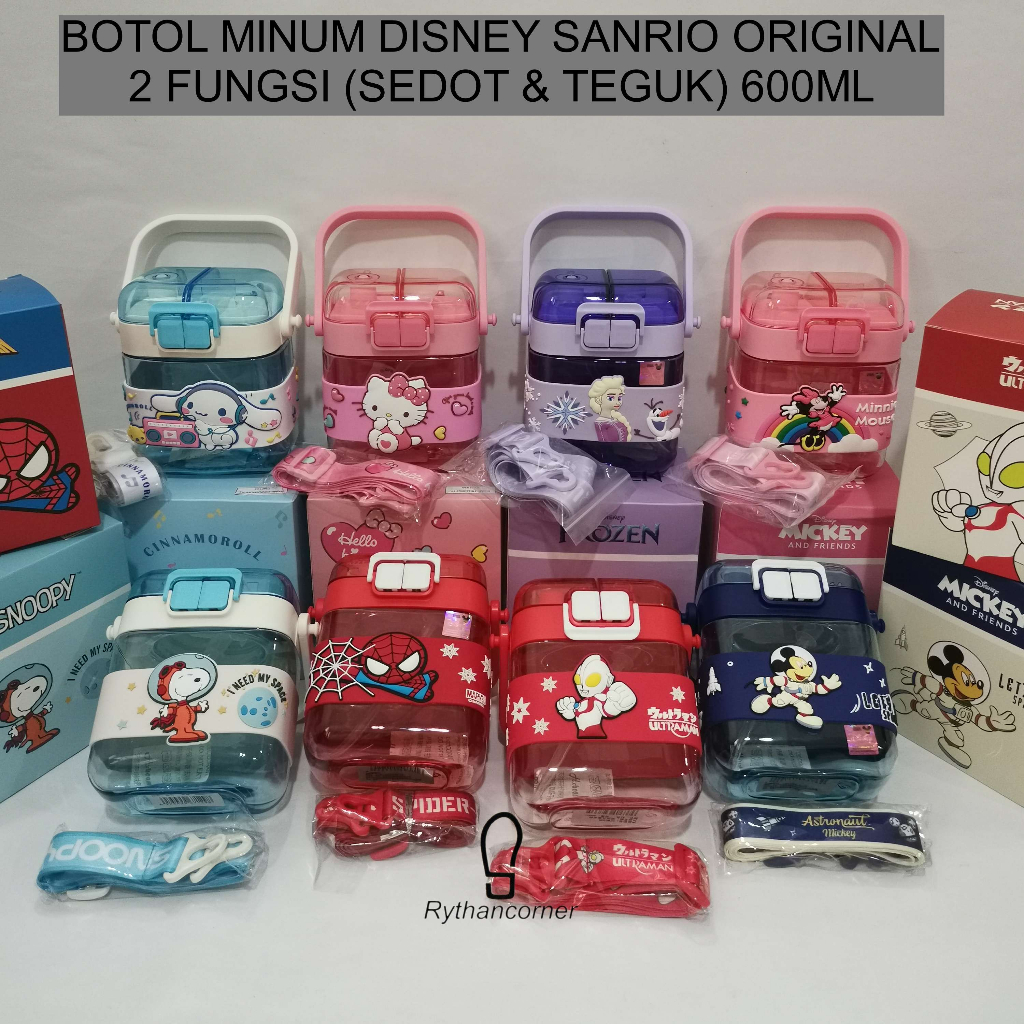 BOTOL MINUM DISNEY SANRIO DUAL FUNGSI, SEDOTAN DAN TEGUK DALAM 1 BOTOL UKURAN : 10X14CM (BOTOL),14x14CM DIUKUR DARI PEGANGAN KAPASITAS 600ML bahan : TRITAN PP BPA FREE