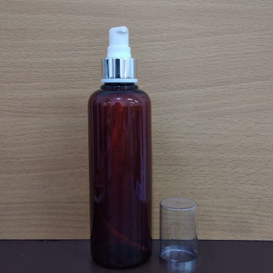 Detail Botol Plastik PET 250ml BR Coklat Amber Tutup Pump Treatment Full Cap Neck