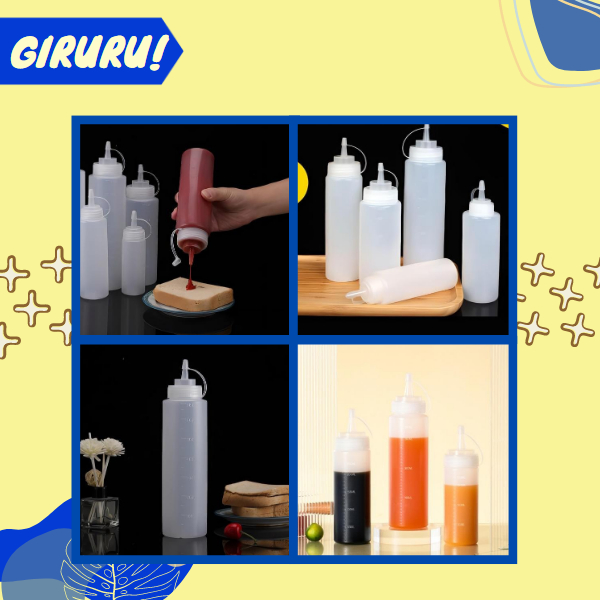 Deskripsi Produk : - Tersedia banyak ukuran (silahkan pilih di variasi) - Warna putih transparant - Bahan plastik - Cocok untuk tempat saus, kecap, mayo, minyak, susu, dll - Badan botol elastis, sehingga mudah untuk ditekan - Aman digunakan sehari-hari - Terdapat tutup botol agar mulut botol steril