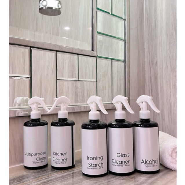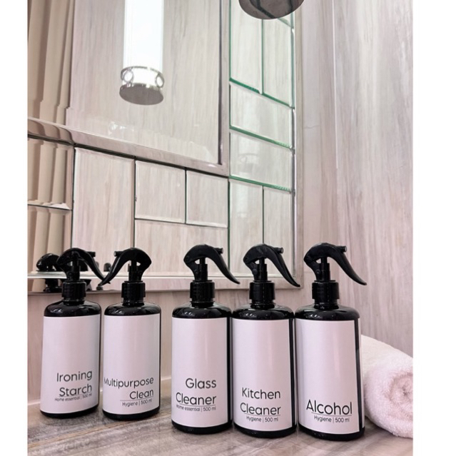 Perlengkapan Rumah > Organizer Rumah > Organizer Meja & Make Up > BOTOL SPRAY HITAM GLOSSY 500ML STIKER AESTHETIC . tempat isi ulang refill kebersihan dapur rumah organizer botol semprot pembersih kaca estetik