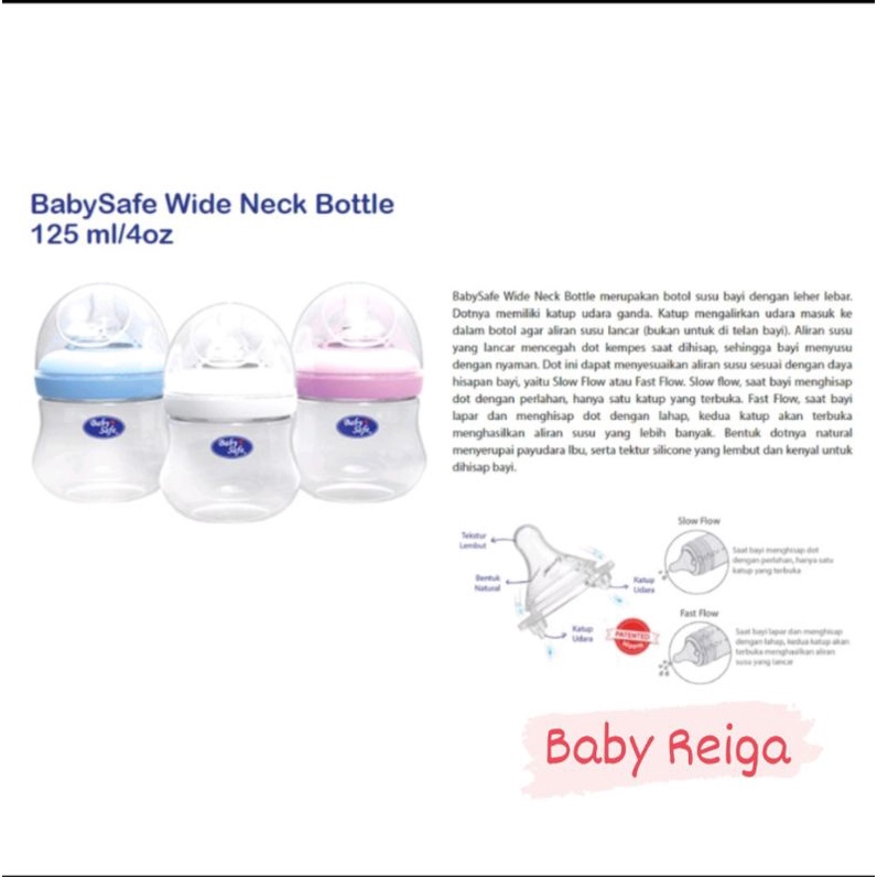 BabySafe Wide Neck Bottle merupakan botol susu bayi dengan leher lebar. Dotnya memiliki katup udara ganda. Katup mengalirkan udara masuk ke dalam botol agar aliran susu lancar (bukan untuk di telan bayi). Aliran susu yang lancar mencegah dot kempes saat dihisap, sehingga bayi menyusu dengan nyaman. Dot ini dapat menyesuaikan aliran susu sesuai dengan daya hisapan bayi, yaitu Slow Flow atau Fast Flow. Slow flow, saat bayi menghisap dot dengan perlahan, hanya satu katup yang terbuka. Fast Flow, saat bayi lapar dan menghisap dot dengan lahap, kedua katup akan terbuka menghasilkan aliran susu yang lebih banyak. Bentuk dotnya natural menyerupai payudara Ibu, serta tektur silicone yang lembut dan kenyal untuk dihisap bayi.