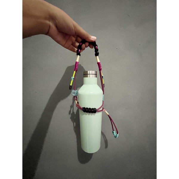 - Ukuran bisa diadjust menggunakan stopper - Bisa digunakan pada botol berukuran keliling max. 28cm (bisa request ukuran) - Disarankan untuk dipakai dengan beban max. 1,5 lt air - Baik digunakan untuk model tumbler yang bagian atasnya lebih besar - Material tali kualitas terbaik