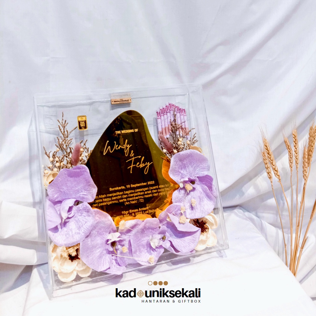 Detail Produk : - Frame Transparant Akrilik 3D ukuran 30x30x6 cm - Frame bisa dibuka - Garansi 100% (Wajib pesan produk Safety pack dietalase) - Nama diukir menggunakan Laser-Cut jadi sangat rapih dengan bahan Akrilik GOLD - Rangkaian bunga Anggrek dan daun kering asli diawetkan dengan cara sintetis 100% tidak akan rusak dan tidak akan layu - Bebas Request tulisan dan jumlah mahar dan jenis mahar - Harga sudah termasuk semua Aksesoris yang ada didalam bingkai kecuali ,koin, dan emas dan gulungan uang (tersedia dietalase)