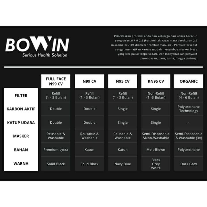 Bowin Balaclava Full Face - Filter N99CV (Masker Motor - Ninja) Prioritaskan proteksi anda dan keluarga dari udara beracun yang disertai PM 2.5 (Partikel tak kasat mata berukuran 2.5 mikrometer / 3% diameter rambut manusia). Partikel paling mematikan karena mudah menembus masker biasa yang kita pakai tanpa sadari. Dan menyebabkan penyakit pernapasan, paru, asma, hingga jantung.