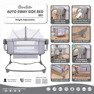 Auto Sway Sidebed Fitur: - Dapat digunakan dari usia newborn sampai berat maksimum anak 15 kg - Terdapat 3 mode: Bassinet mode, Bedside Sleeper mode, Crib option mode - Auto sway Mode, gerakan lembut seperti lengan ibu - Kanopi dengan mainan gantung dan dilengkapi jaring anti nyamuk - Gentle Touch Control Panel untuk mengatur waktu, kecepatan ayunan, dan musik - Menggunakan baterai AA / LR 6 sebanyak 4 buah - Remote control dan bluetooth - 5 kecepatan ayunan - Lockable wheels - Removable cradle & folding frame tube 80cm x L45cm x t3cm ========= Auto Sway Side Bed MX, side bed baru dari @cocolatteindo! Memiliki space yang lebih luas untuk si kecil dan disertai “gentle touch control panel” yang dilengkapi dengan 5 kecepatan ayun Selain itu, side bed ini memiliki 3 ketinggian yang bisa disesuaikan dengan tempat tidur Moms & Dads, lho! 😍 Features: - For newborn up to 18kg - Bassinet Mode - Playard Mode - Crib Alternative - Bedside Mode - Cradling Swing - Breathable Mesh - 5 swing speeds - 15 Melodies & 3 timer setting (15', 30', 45') - 3 height adjustment - Storage Pocket - 4 Lockable wheels - Gentle touch control panel - Washable mattress - Connect with mobile to play personalized music - Play audio files with MP3 format from USB flash drive - Powered by a USB cord to save on batteries (not included) - Mosquito net - Requires 4 AA/LR6 Batteries (not included)