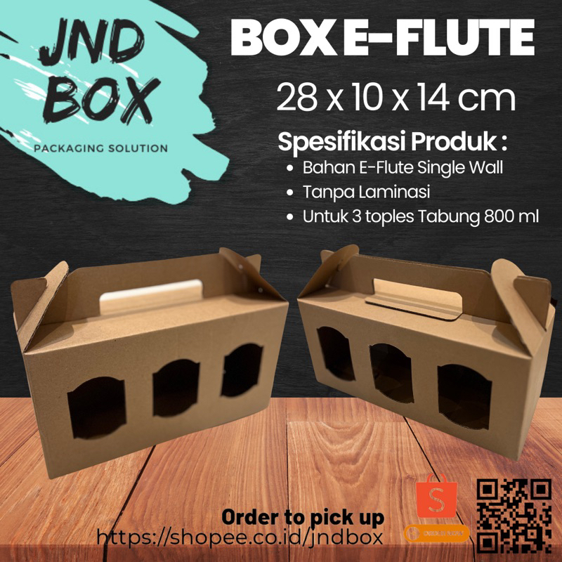 - Ukuran 28 x 10 x 14 cm (PxLxT) - Bahan Eflute Single Wall - Tanpa Laminasi - Untuk 3 Toples tabung 800 gram - MINIMAL 5 PCS