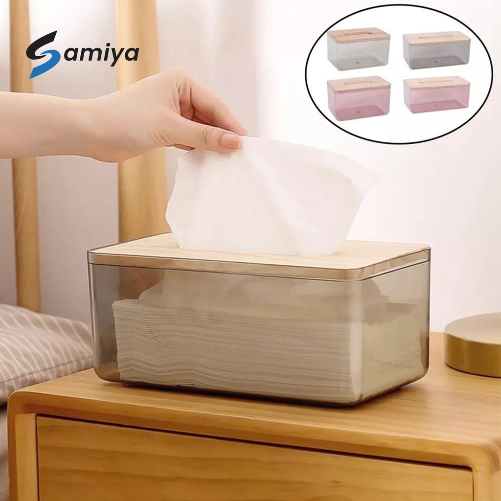 Detail box kotak tempat tissue transparan bamboo lid / tempat tisu korea tutup bambu box kotak bening
