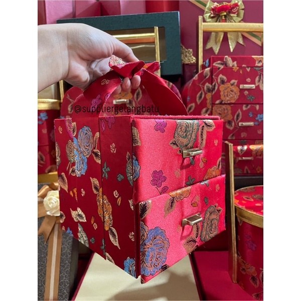 box kue EDISI IMLEK Laci 2 (ukuran per laci 15x15 cm) 1 laci bisa muat toples 500gram atau 2 toples 250gram yg persegi panjang yg ukuran 14x7cm bahan hardbox lapisan cheongsam motif bunga PO 7-14 hari silahkan diorder mau tambah emblem happy imlek +5000 ya silahkan cek varian