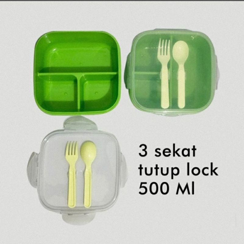 Fitur : - Material menggunakan bahan plastik food grade, sangat aman digunakan untuk anak-anak. - Dilengkapi dengan 3 sekat pada kotak makan berikut sendok dan garpu yang dapat disimpan di tutup kotak makan - Dilengkapi dengan warna-warna yang colourful - Bisa digunakan untuk penyimpanan makanan panas maupun dingin - Mudah untuk dibersihkan