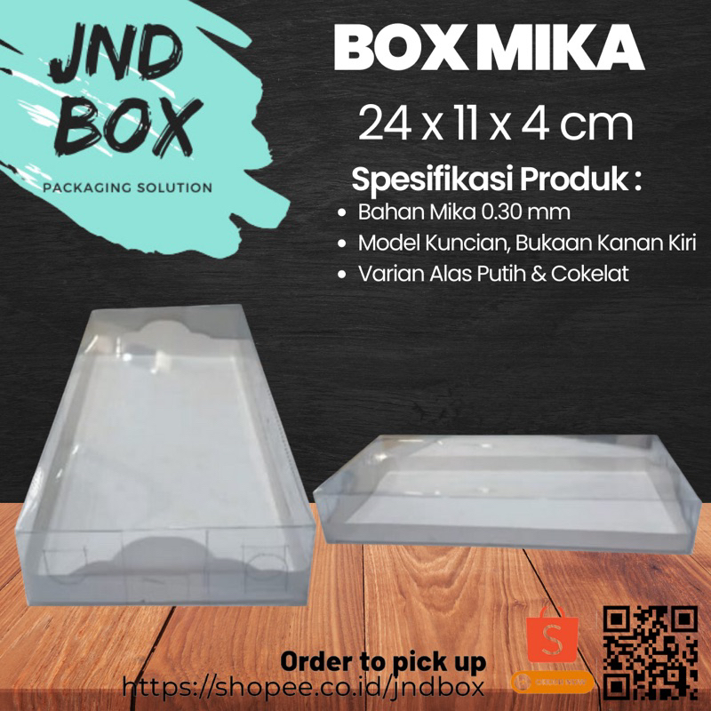 - Box mika doskue 24 x 11 x 4 - Model Doskue (bukaan atas) - Bahan mika tebal 0,20 mm - Include alas - Alas coklat (bahan kertas craft laminating) - Alas putih (bahan kertas ivory tanpa laminating)