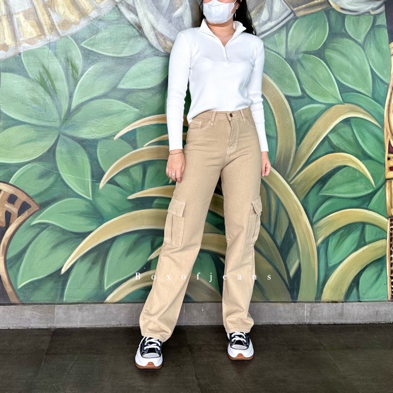 Model : Loose Jeans + Cargo Material : Soft Denim Non-Stretch Waist : Super High Waist ( diatas pusar , FR 32cm ) Leg Type : Straight Leg ( kaki lurus ) Color : Khaki