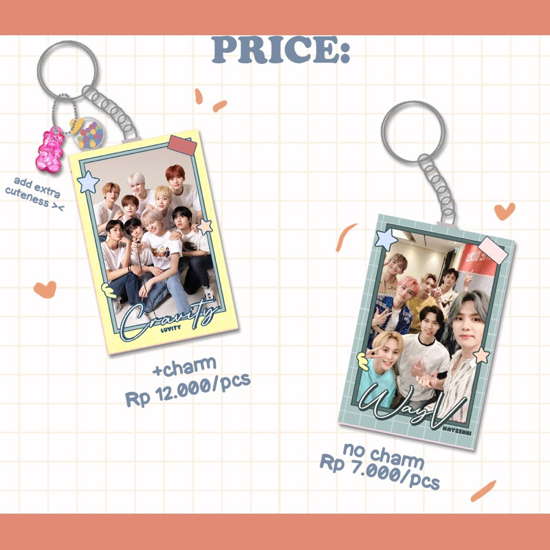 DETAILS ✨ Insert Acrylic Keyring 💸Harga : - 7.000 (no charm) - 12.000 (with charm) ☑️Size: 3.5cm x 5.5cm ✨Bahan: Acrylic ➡️ double side picture (gambar bolak balik)