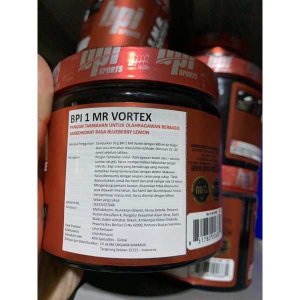 BPI 1.M.R Vortex suplemen preworkout (digunakan sebelum latihan) revolusioner dari produsen BPI sports,dengan ukuran 50x serving. Suplemen 1.M.R Vortex memastikan anda tidak akan pernah kekurangan tenaga selama berlatih.Suplemen penambah tenaga BPI 1.M.R Vortex menggunakan bahan herbal yang teruji kualitasnya seperti Caffeine Anhydrous dan Yohimbe yang juga dapat menigkatkan Human Growth Hormone (HGH).BPI 1.M.R Vortex aman digunakan bagi siapa saja yang tidak memiliki masalah dengan kafein pria dan wanita dapat menggunakan suplemen 1.M.R Vortex.