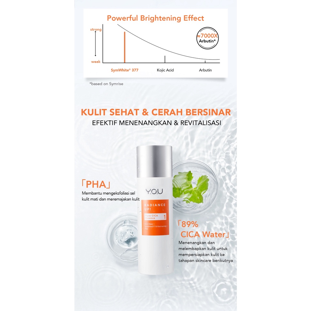 Radiance Up! Pure CICA Essence Y.O.U Radiance Up! Pure CICA Essence diperkaya dengan kandungan Symwhite 377, 89% Centella Asiatica, 3% Niacinamide, Vitamin C, dan Lactobionic Acid (PHA) yang menenangkan, mencerahkan, dan mengeksfoliasi dengan lembut untuk kulit yang cerah berseri.