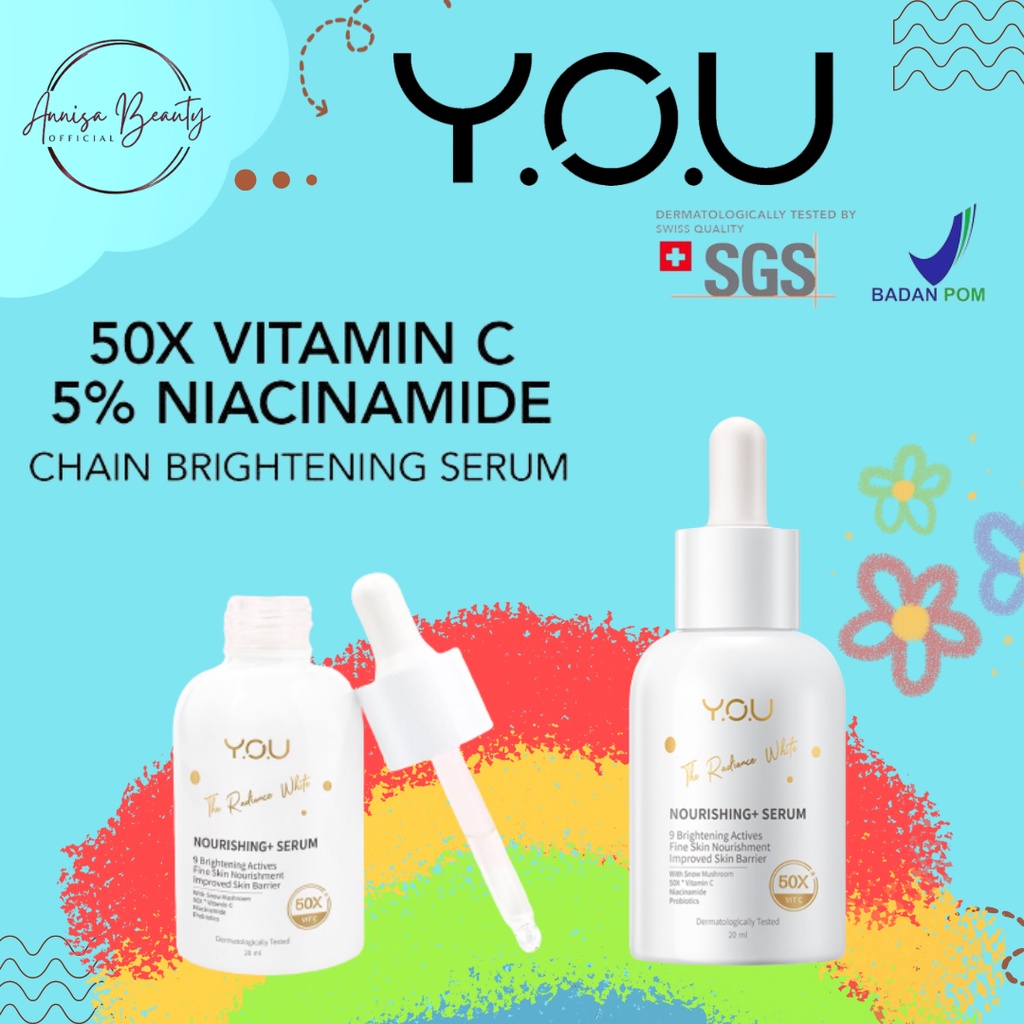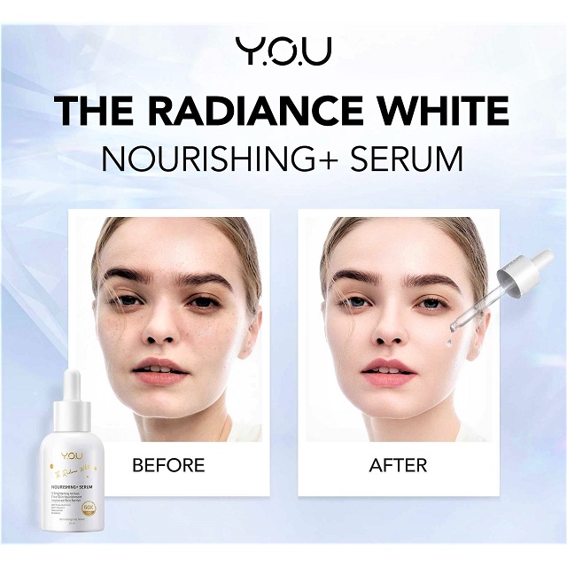 Y.O.U The Radiance White Nourishing+ serum diperkaya dengan kandungan 50X* Vitamin C, 5% Niacinamide, Snow Mushroom Extract dan Probiotics yang bekerja secara sinergis untuk membantu menutrisi kulit agar tampak lebih sehat dan bercahaya.