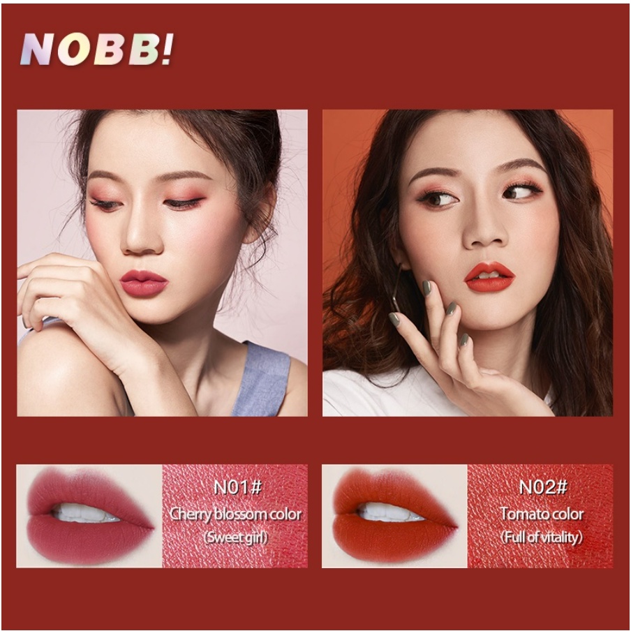NOBB Air matte velvet lipstick: Tekstur beludru cocok untuk semua warna kulit Seringan udara, meleleh saat Anda menyentuh bibir Anda (sentuhan matte halus) Ringan tanpa rasa (tekstur matte cair padat, melembapkan, ringan dan tidak lengket) Tahan lama, tahan air dan melembabkan (warna cerah, bibir matte tanpa mengeringkan, tahan air dan Melembabkan).