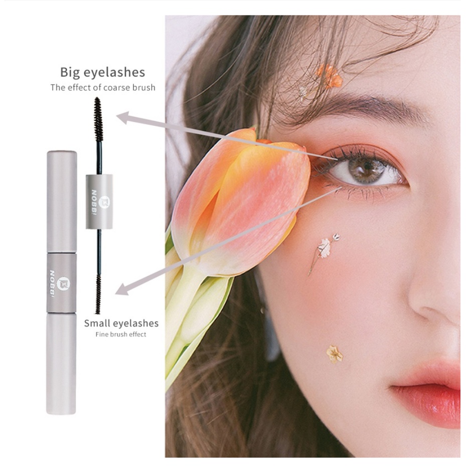 NOBB Double Mascara (BPOM No. NA11221200043): 2 Jenis brush dengan 2 ukuran berbeda (kecil 2.5mm, besar 4mm) Brush yang kecil memanjangkan bulu mata yang tipis dan pendek. Brush yang lebih besar menjadikan efek bulu mata yang tebal dan lentik.