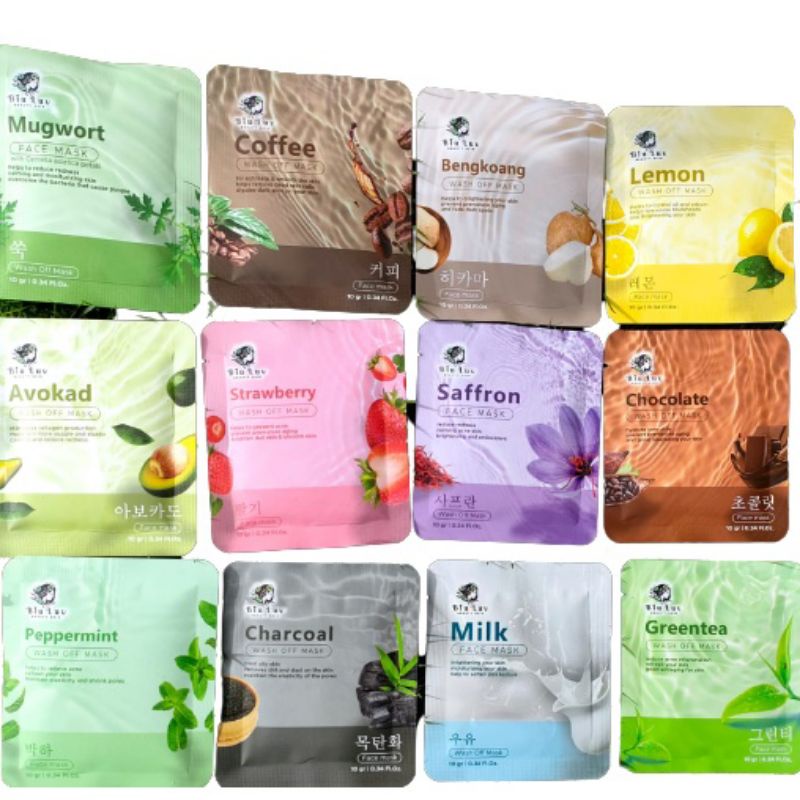 variant dan manfaat : • Biu Luv Lemon -mengatasi komedo,mencerahkan kulit,mengatasi minyak dam sebum yang berlebih dikulit,mengurangi jerawat • Biu Luv Avocad -merangsang produksi kolagen pada kulit,membuat kulit lebih kenyal dan elastis,mengurangi kemerahan akibat sinar matahari • Biu Luv Pepermint -membantu mengatasi & meredakan jerawat, menjaga elastisitas kulit, mengecilkan pori-pori,membuat kulit lebih segar • Biu Luv Saffron - mengurangi kemerahan pada kulit (anti inflamasi),menenangkan kulit yang berjerawat,mencerahkan dan sebagai antioksidan,wajah makain glowing • Biu Luv Strawberry -mencegah timbulnya jerawat, mencerahkan kulit kusam,menghaluskan kulit,mencegah penuaan dini. • Biu Luv Milk - mencerahkan dan meratakan warna kulit,menghaluskan tekstur kulit,melembabkan kulit wajah,menutrisi kulit, mengecilkan pori-pori • Biu Luv Greentea -mengurangi peradangan pada jerawat,menyegarkan kulit,sebagai antioksidan,menghilangkan kantung panda • Biu Luv Chocolate - mencegah penuaan dini seperti kerutan halus pada kulit,menutrisi kulit wajah, menghidrasi kulit wajah,menghaluskan kulit • Biu Luv Charcoal - merawat kulit berminyak, menjaga elastisitas pori pori kulit, mengangkat kotoran dan debu pada kulit,detoxsifikasi kulit, • Biu Luv Coffe- mengangkat sel kulit mati,menyamarkan noda hitam di wajah,eksfolasi kulit,melembutkan kulit,menutrisi kulit. • Biu Luv Bengkoang - mencerahkan kulit,memudarkan bekas jerawat & flek ,mecegah penuaan dini, menghaluskan kulit.